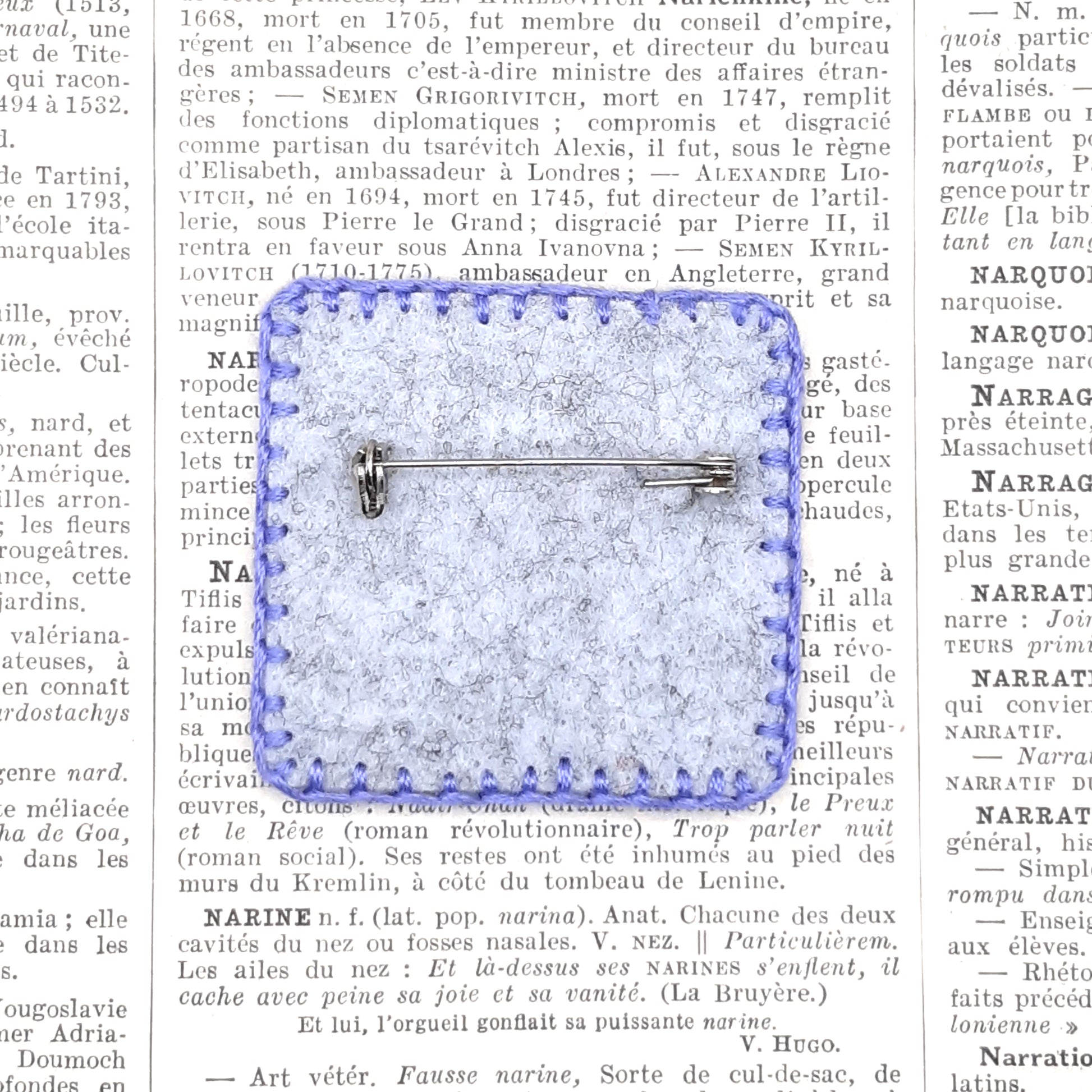 Le contour de la broche est entièrement brodé, assurant à la fois solidité et finition visible, l'épingle au dos en inox. Elle mesure environ 48 mm sur 46 mm et 5 mm de profondeur.