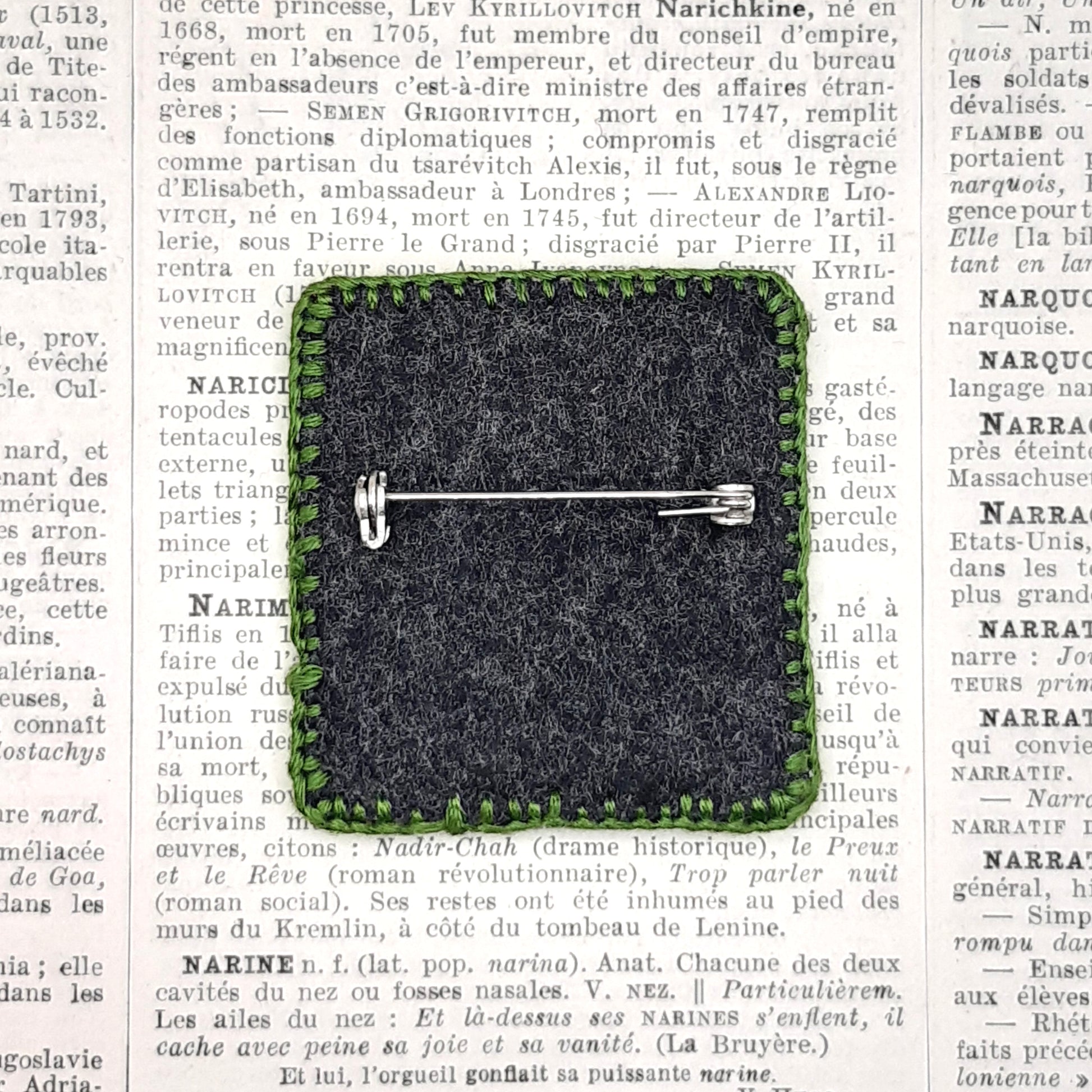 Le contour de la broche est entièrement brodé, assurant à la fois solidité et finition visible, l'épingle au dos en inox. Elle mesure environ 44 mm sur 47 mm et 5 mm de profondeur.